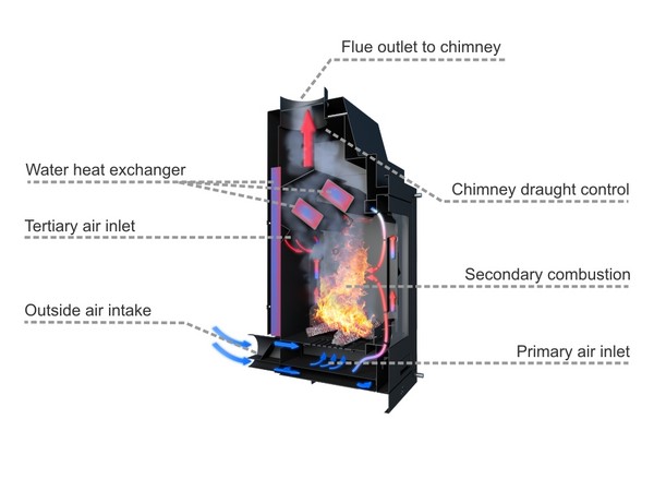 Secondary combustion / Secondary combustion ensures a clean combustion glass screen and perfect combustion of the exhaust gases thanks to a special slot for the secondary and tertiary air that causes a double air wash on the glass of the combustion door crystal screen using preheated air